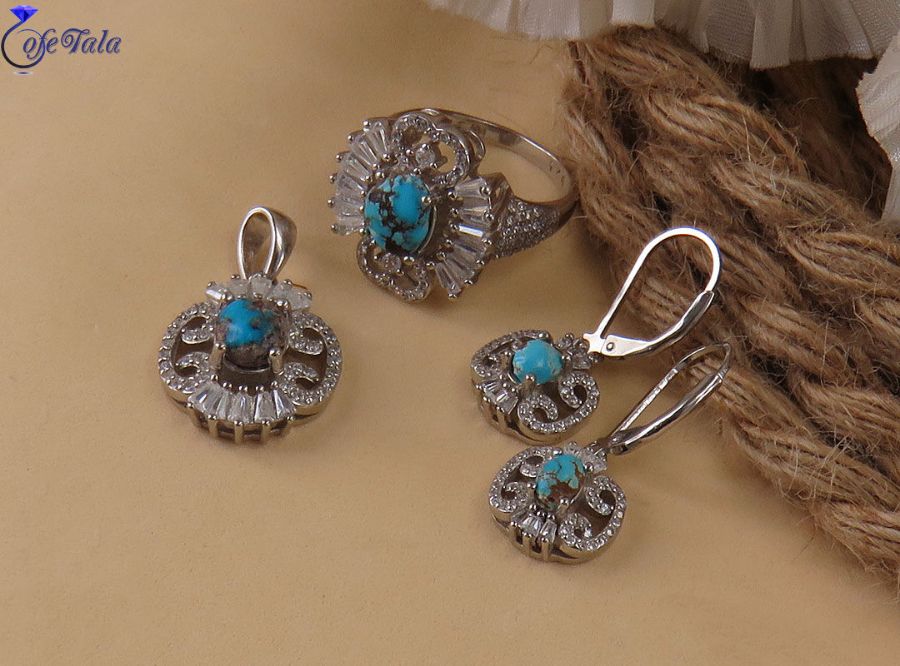 ست های نقره فیروزه دست ساز ساخته شده توسط هنرمندان خوب کشورمان است و از نقره عیار بالا و سنگهای فیروزه اصل نیشابور و معدنی بهره میبرد. گردنبند و دستبند در کنار گوشواره های آویز ، محصولی زیبا و خاص را تشکیل داده اند. استفاده از نقره عیار 925 آسودگی خاطر را برای کاربر به همراه دارد. فیروزه نیشابور بخاطر خواص درمانی بسیاری که دارد از دیرباز مورد توجه قرار گرفته است. شاید آنطور که باید این سنگ ارزشمند در کشورمان مورد توجه و حمایت قرار نگرفته ولی این سنگ زیبا در کل دنیا مورد توجه است و استفاده های گوناگونی از فیروزه نیشابور میشود.